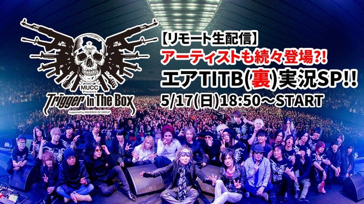 この番組は、本日5月16日と明日17日の2日間にわたりYouTubeとニコニコ動画で配信されている「Live at Trigger In The Box 2019」の裏企画。本編となる「Live at Trigger In The Box 2019」は昨年12月28日に東京・国立代々木競技場第一体育館で開催されたMAVERICK DC GROUP主催のライブイベント「MUCC Presents『Trigger In The Box』」の映像配信企画で、出演者たちのパフォーマンスがYouTubeとニコニコ動画にて入れ替わりで配信される。