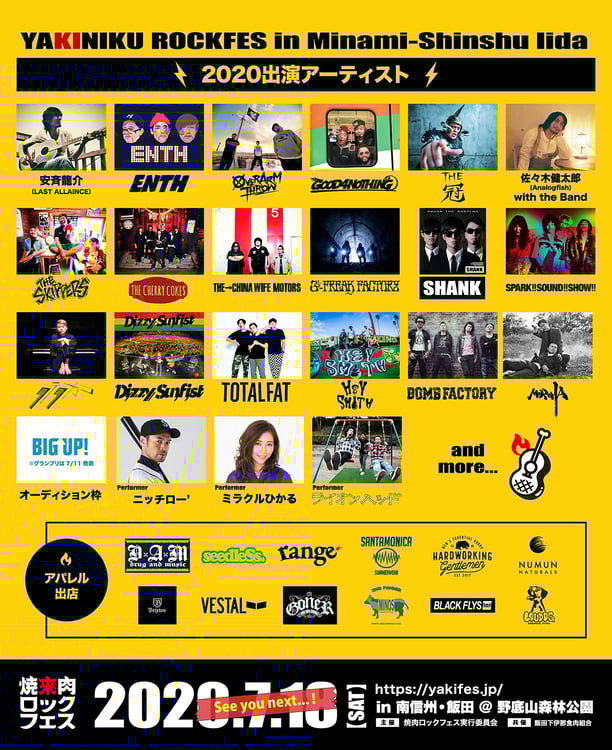 7月18日に長野・野底山森林公園で開催予定だった野外フェス「焼來肉ロックフェス2020 in 南信州・飯田」の中止が発表された。