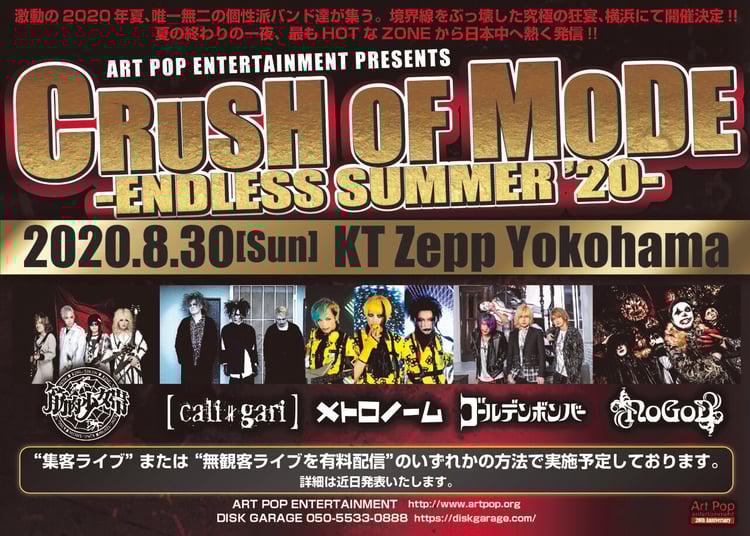 ヴィジュアルシーンの夏の恒例行事であるサーキットイベント「CRUSH OF MODE」。今年は7月と8月に東名阪のライブハウスを舞台にした「CRUSH OF MODE -HYPER HOT SUMMER-2020」が行われることがすでに決定しているが、さらにその集大成としてKT Zepp Yokohama公演も開催されることになった。このイベントには筋肉少女帯、ゴールデンボンバー、cali≠gari、メトロノーム、NoGoDの5組が出演。会場に観客を入れての通常通りのライブになるか、無観客での有料配信ライブになるかはまだ未定とのこと。