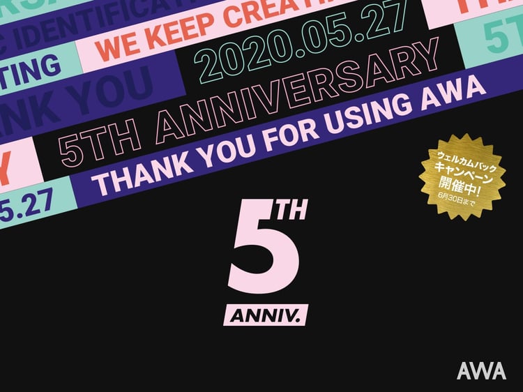 併せて特設サイトではAWAの5年間の歴史をまとめた年表や、ユーザーが5年の間に聴いた楽曲トップ100のプレイリストを公開中。さらに浜崎あゆみ、谷中敦(東京スカパラダイスオーケストラ)、大沢伸一(MONDO GROSSO)、☆Taku Takahashi(m-flo)、田中知之(FPM)、THE RAMPAGE from EXILE TRIBE、PUSHIM、おかもとえみ、大塚愛、山本彩、SILENT SIREN、Novelbright、高柳明音(SKE48)、YUKA(moumoon)、OSSHYからの祝福コメントや、これまでのAWA利用ユーザー名一覧も掲載されている。