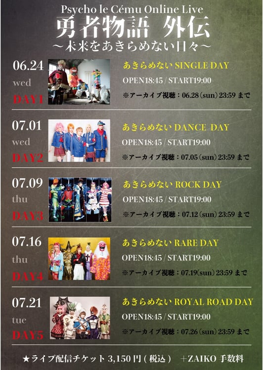 Psycho le Cemuが6月24日から5週にわたって有料ライブ配信「勇者物語 外伝~未来をあきらめない日々~」を行う。