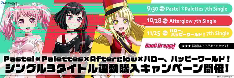 スマホ向けゲーム「バンドリ! ガールズバンドパーティ!」に登場するバンド・Pastel*Palettes、Afterglow、ハロー、ハッピーワールド!の7thシングルが9月から11月にかけてリリースされる。
