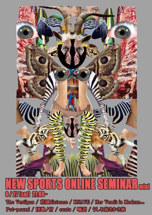 「ニュー・スポーツ・オンラインセミナー」は各出演者の未発表ライブ動画やミュージックビデオを、うしろ前さかさ族のメンバーによるコメントと共に配信する企画。5月の初開催に続き2度目の実施となる今回はさかさ族に加えKNAVE、喃語、花園distance、Pot-pourri、Her Vomit is Modern…、団地ノ宮、The Vertigos、cuntsが参加する。
