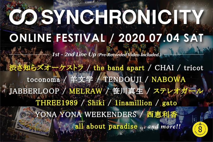都市型音楽フェス「SYNCHRONICITY」が7月4日に実施する配信イベント「SYNCHRONICITY2020 ONLINE FESTIVAL」の出演アーティスト第2弾が発表された。