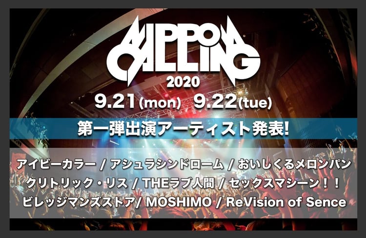 「NIPPON CALLING 2020」は2016年より毎年東京の下北沢、新宿、渋谷で行われてきたサーキットフェス「TOKYO CALLING」が今年は新型コロナウイルス感染症拡大の影響で通常開催ができなくなったことを受けて企画された新たなイベント。第1弾ではアイビーカラー、アシュラシンドローム、おいしくるメロンパン、クリトリック・リス、THEラブ人間、セックスマシーン!!、ビレッジマンズストア、MOSHIMO、ReVision of Senceの9組の出演が発表された。各アーティストの出演日は追ってアナウンスされる。