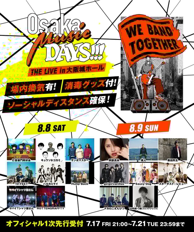 ラインナップされたアーティストは、8月8日公演に打首獄門同好会、キュウソネコカミ、サンボマスター、10-FEET、ハルカミライ、Hump Back、ヤバイTシャツ屋さん、ROTTENGRAFFTY、8月9日公演に阿部真央、瑛人、奥田民生、go!go!vanillas、Saucy Dog、スターダスト☆レビュー、マカロニえんぴつ、山内総一郎(フジファブリック)の全16組。接触感染を防止するため、チケットは電子チケットのみで販売され、全チケットに消毒グッズが付く。また通販サイトにて1650円で販売されるイベントオフィシャルマフラータオルは、経費を除く収益の全額が日本のライブエンタテインメント産業を支援する基金「Music Cross Aid」に寄付される。