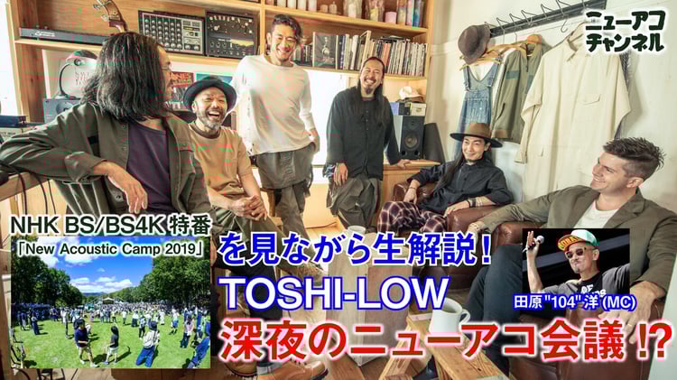 配信当日の23:45からはNHK BSプレミアム、NHK BS4Kにて昨年開催の「New Acoustic Camp 2019」が再放送される。今回の配信ではTOSHI-LOWがこの放送を視聴しながら、リアルタイムで生解説を行う。MCはアパレルブランド・MOBSTYLESを手がける田原“104”洋氏が務める。