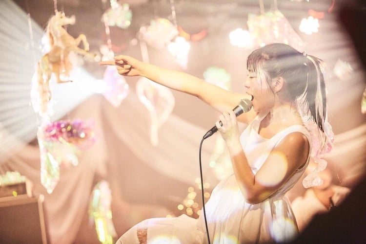 後半戦はMCを挟まず、彩り豊かな楽曲が次々に披露されていく。「BE△UTIFUL」を力強く放ったあと、永原はステージを降り、岡愛子(G)によるアコースティックギターの演奏に乗せて「ダンサー・イン・ザ・ポエトリー」をフロアで熱唱。ステージに戻り、続く「プリズム99%」ではカラフルに彩られたピアニカを情熱的に奏で、「リトルタイガー」では大きなクマのぬいぐるみを肩に乗せて茶目っ気たっぷりに歌ってみせる。
