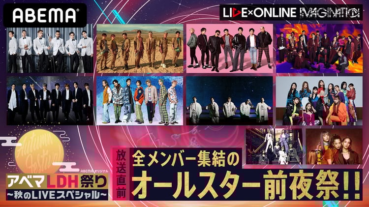 LDHの有料配信ライブ「LIVE×ONLINE IMAGINATION」の開催を記念した事前番組「秋のアベマLDH祭り放送直前!全メンバー集結のオールスター前夜祭」が、9月18日(金)21:00よりABEMAのDELUXEチャンネルで生配信される。
