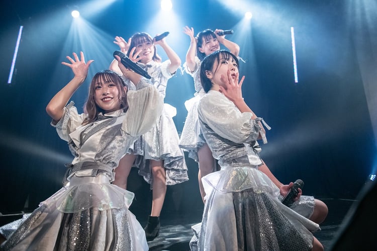 開演時刻を迎えると、ステージに設置された舞台幕にオープニング映像が映し出される。「おかけになった電話番号は現在使われておりません」という通知音とバグが起こったようなカオスな映像が入り乱れたのち各メンバーの写真が一面に映し出されると、会場の期待感は一気に高まる。そして1曲目「コーリング」のイントロが流れ出し、ゆっくりと幕が上がると、真っ白な衣装に身を包んだ小町まい、夏芽ナツ、藤井エリカ、西脇朱音の4人が姿を現す。激しいサウンドに4人の歌声が重なり、会場のボルテージは一気に上昇。1stワンマンライブにふさわしい幕開けとなった。その後自己紹介を挟み、MCでは西脇が「楽屋でみんなドキドキしてました」とメンバーの緊張を明かす。続けて「次は駆け出し中の私たちにふさわしいこの曲です」という紹介と共に披露されたのは「Step by Step」。手拍子も交えたパフォーマンスで会場は一体感に包まれていく。さらに4人は「Follow You Follow Me」を立て続けにパフォーマンスし、会場の熱気を高めていった。