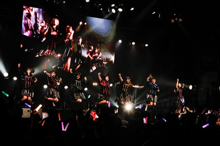 その後、7人は先輩グループであるまねきケチャの人気曲「ありきたりな言葉で」「冗談じゃないね」を連続でカバーする。ライブ中盤にはアコースティックギターを手に取った日高里緒が全員で高梨螢の家に集まって練習したという「タイムマシン」を演奏し始め、メンバーはその音色に合わせてボーカルリレーを展開。感情のこもったメンバーの歌声に対し、日高は「みんな歌唱力があるので、安心して弾けました」と笑顔で感想を語った。緊張感あるパフォーマンスが終わると、ライブはいよいよラストスパートに突入。アッパーチューン「ニモジ」やロックナンバー「Brand New Me」が披露され、ファンはコールやシンガロングの代わりにペンライトの光やハンドクラップでそれに呼応した。デビュー曲「細胞」では情熱的な歌とダンスが届けられ、サビで高梨の力強い飛び蹴りが炸裂した。