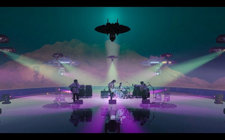 この公演のハイライトとなったのは、「最後までフレデリックの世界観に浸ってください。よろしくお願いします」という健司の前振りから始まったINTとのコラボレーションパート。浮遊感のあるサウンドの「真っ赤なCAR」ではメンバーやステージにネオンカラーのエフェクト加工が施され、「Wake Me Up」では画面にカラフルな立方体が多数出現。図形の中にメンバーのパフォーマンスの模様が映し出されたほか、ワケメが登場して曲に合わせてキュートなダンスを披露した。続く「ひっくりかえす」や「SENTIMENTAL SUMMER」では歌詞が画面に現れ4人のパフォーマンスに彩りを添えていた。それまでもバンドはオンラインライブならではのステージでチャット欄やSNSを沸かせていたが、ここからさらにエンタテイメント性の高い映像演出を届けて視聴者を驚かせた。画面が暗転した後、4人はバーチャル空間へ移動。周りに謎の飛行物体が浮かぶ、フレデリックの最新のアーティスト写真を彷彿とさせる天空要塞のような場所で、テンポに緩急のある「バジルの宴」を演奏した。「アウトサイドの海」では楽曲名になぞらえた深海のような空間で、ゆったりとたゆたうようなメロディが奏でられた。