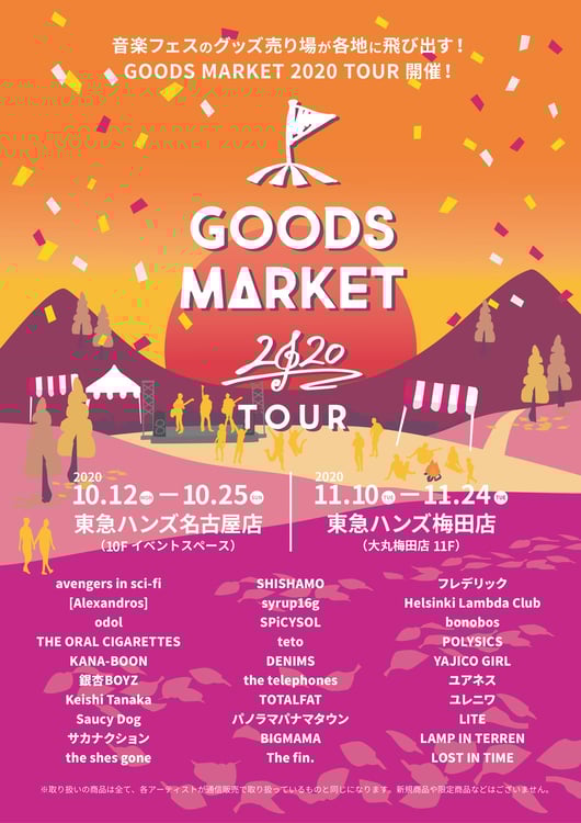「GOODS MARKET 2020」は、新型コロナウイルス感染拡大の影響により音楽フェスやイベントの中止が発表される中、アーティストグッズを実際に手に取って購入する機会を提供するべく企画されたもの。8月に東京・東急ハンズ渋谷スクランブルスクエア店で第1回が開催され、多くの音楽ファンの話題を集めた。「GOODS MARKET 2020 TOUR」はこの反響を受けて企画されたもので、タイトルの通り愛知と大阪にてツアー形式で実施される。