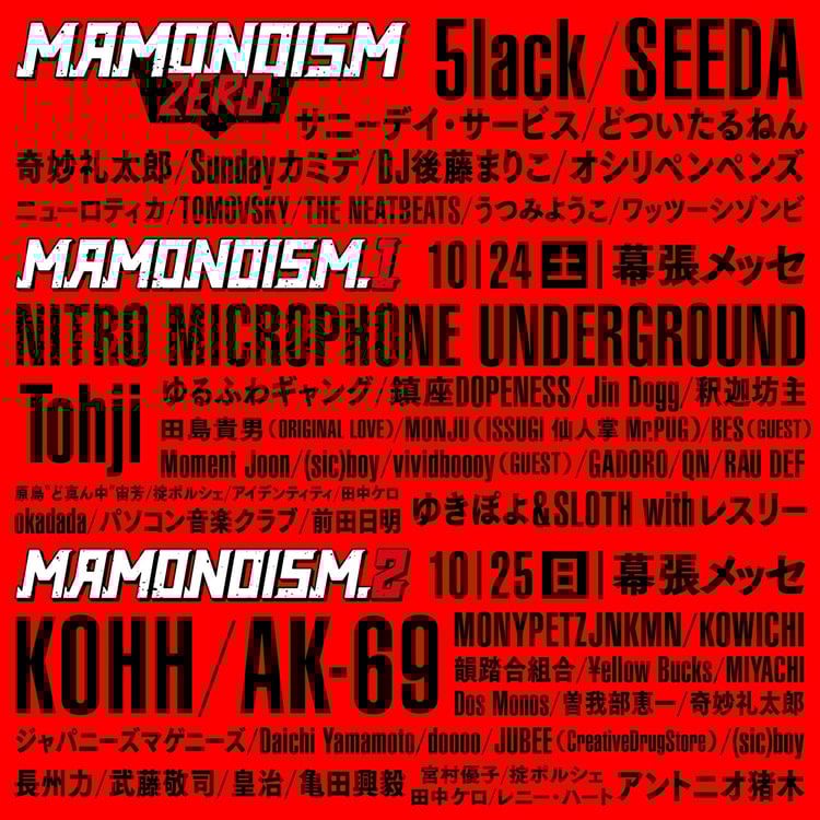 新型コロナウイルス感染症対策を万全に講じ、国の定めたガイドラインに沿った座席数で行われる本公演。初日公演「MAMONOISM.1」にはヘッドライナー枠でNITRO MICROPHONE UNDERGROUND、2日目公演「MAMONOISM.2」には奇妙礼太郎が出演することが明らかになった。また両日公演に元新日本プロレスリングアナウンサーの田中ケロ、2日目公演にPRIDE、RIZINの選手入場コールの巻き舌でおなじみのレニー・ハートが参加することも決定。チケットはイープラスで販売されている。