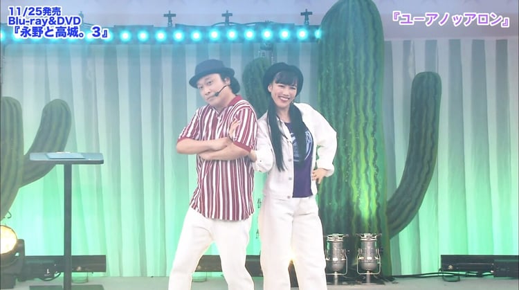 このBlu-ray / DVDは、昨年10月24~26日に東京・恵比寿ザ・ガーデンホールで行われたツーマンお笑いライブ「エキセントリックコミックショー『永野と高城。Vol.3』」千秋楽の模様を映像化したもの。「ユーアノッアロン」は、永野の提案により制作された「永野と高城。」初のテーマソングで、 2人が歌詞を書き下ろし、ヒャダインが作曲を手がけた。今回公開された映像では永野と高城のコントのような息ぴったりのかけ合いや絶妙なハーモニー、「あなたは繊細な雰囲気を醸し出すけど骨格がしっかりしている」「縁もゆかりもないけど 素敵な街だよ麻布十番」などのユーモアあふれる歌詞を楽しむことができる。