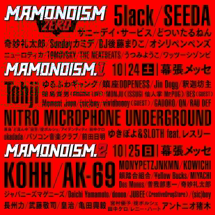 Tohji / NITRO MICROPHONE UNDERGROUND / ゆるふわギャング / 鎮座DOPENESS / 田島貴男(ORIGINAL LOVE) / GADORO / 釈迦坊主 / Jin Dogg / Moment Joon / (sic)boy / vividboooy(ゲスト) / MONJU(ISSUGI / 仙人掌 / Mr.PUG) / BES(ゲスト) / QN / RAU DEF / 原島“ど真ん中”宙芳 / okadada / パソコン音楽クラブ / 掟ポルシェ / アイデンティティ / 前田日明 / ゆきぽよ&SLOTH withレスリー