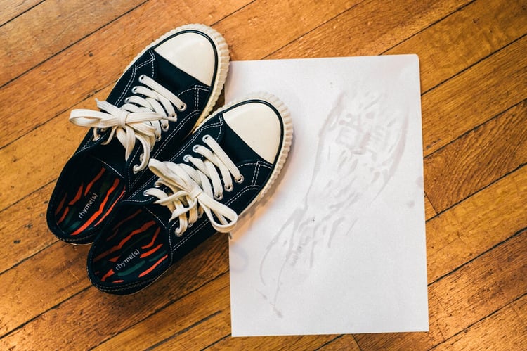 韻を愛する“愛韻家”として知られるLITTLE。プロデュースしたスニーカーの真っ赤なアウトソールには、「韻」の文字が象られており、これを履けば誰でも韻を物理的に踏むことができる。