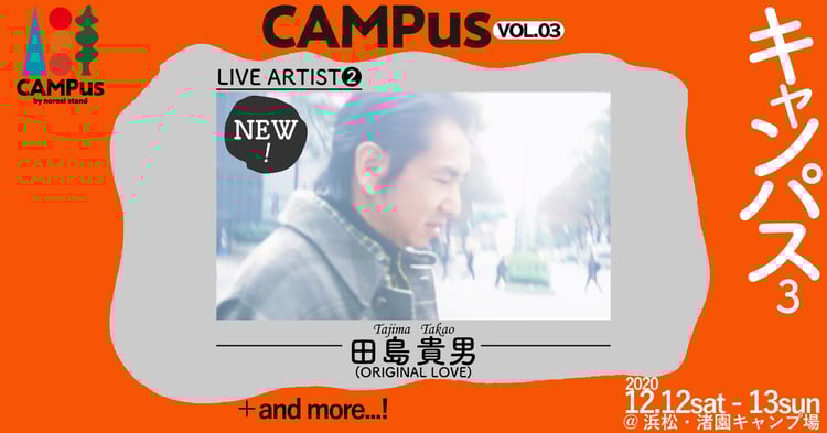 「CAMPus」は8月に初開催された野外イベント。3回目となる今回は“冬のキャンプ”に焦点を当て、広大な芝生エリアが車の乗り入れ可能なオートサイトとして開放される。入場組数を限定して行われるので、キャンプ、音楽、映画をゆったりと楽しめる。出演者は第1弾でラインナップされた前野健太に続き、新たに田島貴男(ORIGINAL LOVE)の出演が決定。今後も追加アーティストが発表されるので、続報にも注目しておこう。