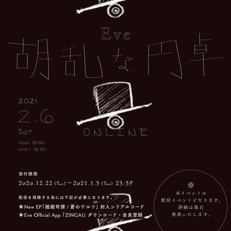 「胡乱な円卓」は今年12月23日発売される新作CD「廻廻奇譚 / 蒼のワルツ」の購入者を対象としたイベント。視聴には、CDに封入されるチラシに記載されたシリアルコードと、Eveの公式アプリ・ZINGAIのダウンロードおよび会員登録が必要となる。