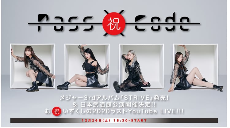 PassCodeが明日12月26日(土)18:30からYouTube Liveで年内最後の生配信「祝!メジャー3rdアルバム『STRIVE』発売&祝!日本武道館公演開催決定お祝いずくしの2020ラストYouTube Live」を行う。