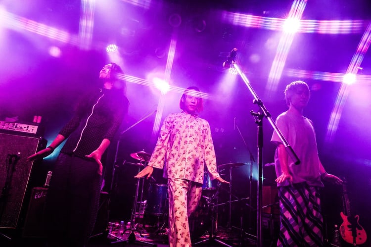 その後マジル声児(B, Cho / 中華一番、百獣)の激しいスラップが炸裂した「大人の事情」、夏目創太(G, Cho)が童貞とマッチングアプリについて朗々と歌う「童貞トキメキ☆パラダイス」など、彼らはジャンルレスなラインナップでライブを進行。一方「ピカデリーナ受精」の間奏では、下川が「あー! 何もうまくいかない!!」「もう無理だ……音楽できない……」とその場でひざまついてしまった。すると彼の友人である梶原笙(So Sorry,Hobo)がステージに現れ、下川の肩にタオルをかけて介抱する。それを見た隅っコたちが温かく拍手し、下川はなんとかカムバックして演奏を続けることができた。
