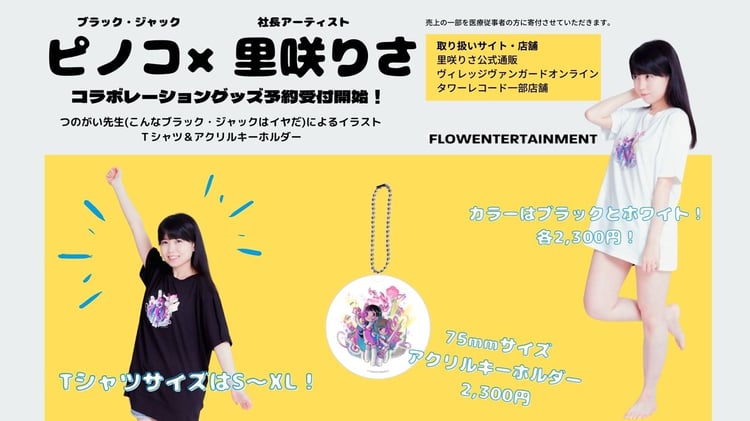 里咲は吉田豪との配信ラジオ番組「吉田豪と里咲社長」の初回放送内でコラボグッズの発売決定を発表。同番組は里咲がかねてよりピノコのファンだったことを受け、手塚るみ子をゲストに迎えていた。コラボグッズはTシャツとアクリルキーホルダーで、デザインにはマンガ「#こんなブラック・ジャックはイヤだ」で知られるつのがいの描き下ろしイラストを使用されている。現在は里咲の公式Webショップとヴィレッジヴァンガードオンラインで予約を受け付けており、8月下旬からはタワーレコードの一部店舗でも販売される予定だ。
