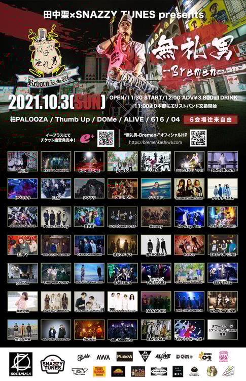 10月3日に千葉・柏の6会場で開催される、田中聖とイベント「SNAZZY TUNES」による音楽サーキットフェス「無礼男-Bremen-」の全出演アーティストが発表された。