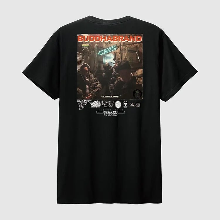 Tシャツはホワイトとブラックの2種類。背中には昨年発売された「これがブッダブランド!」のLP盤のジャケットアートワークがプリントされている。アートワークはNozle Graphicsが手がけた。BUDDHA BRANDのオフィシャルサイトでは、この商品の予約を受け付けている。