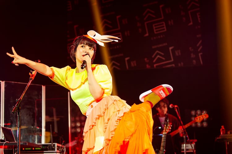 ひさびさの有観客ライブということもあり、眉村はいつにも増してハイテンション。はやる気持ちを抑えるように呼吸を整えると、マユムラーのリズム感が問われる振り付けを急ぎ足でレクチャーした。するとすぐに「壁みてる」へと突入し、間奏ではファンが覚えたての振り付けを見せ、ホール内に一体感が生まれた。その後、ハイチェアに腰かけた彼女が披露したのは「夏のラーメンワルツ」。艷やかなバンドサウンドや兼松のコーラスによって同曲はジャジーにアップデートされた。