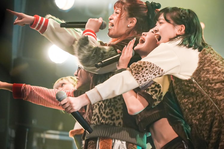 10分ほどの転換を経て、いよいよ新体制でのライブがスタート。先日のclubasia公演のアンコールにてサプライズ披露された新曲「NAKED BORN NAKED DIE」が1曲目に用意され、イントロではステージ前列に既存メンバーの4人が並ぶ。そしてその後ろから新メンバーがはっきりと観客の前にその姿を現した。黒髪、色白の新メンバーは初々しくも元気いっぱいに歌い踊り、「VISITOR」「クマンバチの独白」では4人に負けじと懸命なパフォーマンスを見せつける。「Moonage Driver」をさわやかに届けたあと、自己紹介ではプー・ルイ、SHELLME、CHIYO-P、BAN-BANに続いて、新メンバーが「皆さん初めまして! PIGGSの“おもち担当”、KINCHANです! これからたくさん揉まれて、揉まれておいしくなるぞー!」と挨拶。KINCHANという名であることを明かした新メンバーは、続けて「おもちパーンチ!」とパンチを繰り出し、ぶーちゃんズ(PIGGSファンの呼称)に自身の存在をアピールした。