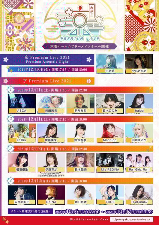 10日のツーマンライブに登場するのは、中島愛とやなぎなぎ。11日の1部にはASCA、熊田茜音、駒形友梨、鈴木このみ、halca、2部にはi☆Ris、伊藤美来、鈴木杏奈、Machico、山崎はるか、12日の1部には相坂優歌、伊藤彩沙、鈴木愛奈、Mia REGINA、Run Girls, Run!、2部には安月名莉子、EXiNA、井口裕香、TRUE、H-el-ical//が出演する。オフィシャルサイトではチケット先行予約を10月17日まで受付中。