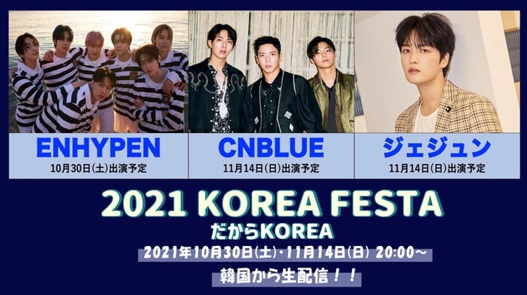 ENHYPEN、CNBLUE、ジェジュンが、10月30日(土)と11月14日(日)にニコニコ生放送でライブ配信されるイベント「2021 KOREA FESTA:だからKOREA」に出演する。