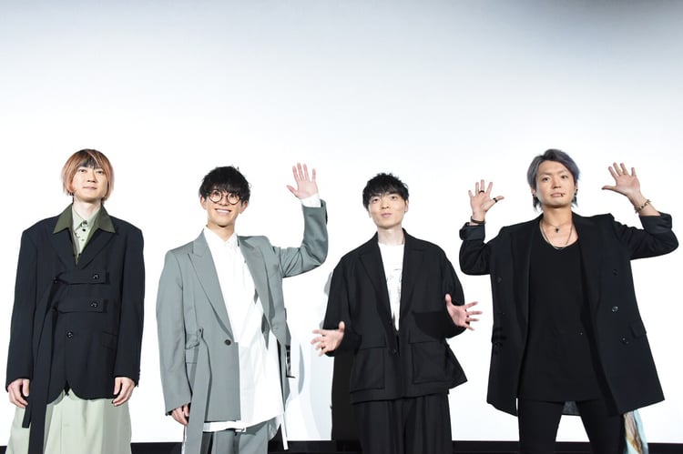 舞台挨拶前に客席でライブ映像を観たという彼ら。江口は「普段は見ることのできないお客さん側からの光景を見れてすごくグッときましたね」と語る。田邊はブルエンがSEとして使用しているMISSPRAYの楽曲について触れ、「MISSPRAYの曲が映画館で流れる時点でエモい。あと今日はせっかくの映画館なので重低音や音の厚みを楽しんでもらいたいですね」とこれから映像を観る観客に呼びかけ、高村佳秀(Dr)は「ドラマーの座っている場所は一番の特等席だと思うんですよね。そのアングルからの映像もあるので楽しんでもらえたらと思います」とアピールした。