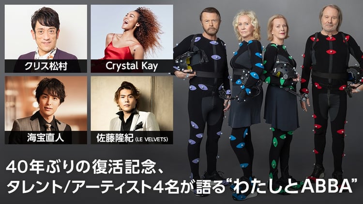 Crystal Kay、海宝直人、クリス松村、佐藤隆紀(LE VELVETS)が参加するABBAの特集第2弾「タレント / アーティスト4名が語る“わたしとABBA”」 が、auスマートパスプレミアムにて公開された。