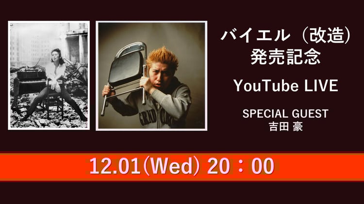 ドレスコーズが12月24日にリリースするカセットテープ付き寄稿集「バイエル(改造)」の発売を記念した番組が、明日12月1日(水)20:00よりYouTubeにて生配信される。