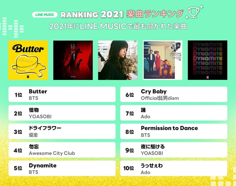 音楽ストリーミングサービス・LINE MUSICにおいて、2021年にもっとも人気だった楽曲やアーティストのランキング「LINE MUSIC 年間ランキング2021」が発表された。