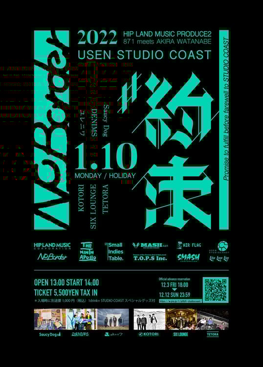 このイベントは、HIP LAND MUSICのPRODUCE 2と、執行役員およびMASH A&Rの副社長も務める871(柳井貢)がTHE NINTH APOLLOのレーベルオーナー・渡辺旭に声をかける形で実現したもの。2人は3年ほど前から交流があり、1月に閉館するSTUDIO COASTからちょうどタイミングのいい空き日程が出たことから開催される運びとなった。イベントにはそれぞれのレーベルからSaucy Dog、DENIMS、ユレニワ、KOTORI、SIX LOUNGE、TETORAの6組が出演する。