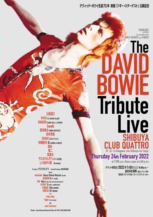 「ジギー・スターダスト」は1月7日から全国で順次上映される、ボウイのライブドキュメンタリー。トリビュートライブにはボウイをリスペクトするメンバーが集結する。出演するのは土屋昌巳、PATA(X JAPAN、Ra:IN)、SUGIZO(LUNA SEA、X JAPAN)、Sandii、西寺郷太(NONA REEVES)、坂本美雨、ISSAY(Der Zibet)、秋間経夫(AKIMA&NEOS)、宙也、竜二、荒瀬大、サエキけんぞう(パール兄弟)、しりあがり寿ら。チケットは1月8日10:00より各プレイガイドで販売される。