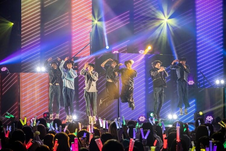 桜木雅哉を“物語”の主人公に、幽玄な世界観のダンスパフォーマンスで古の時代へのタイムスリップを表現した「伊呂波 feat. fox capture plan」、星空がきらめく映像演出をバックに小泉が透き通るような歌声を響かせた「幽かな夜の夢」が届けられると、ライブも折り返し。セットアップからカジュアルなストリートルックに着替えてステージに再登場した7人は、吉澤のクールなラップを皮切りに「0to1の幻想」をドロップする。LEDビジョンにはバイナリーコードが映し出され、ネオンカラーの光が鮮やかに会場を照らす中、メンバーは四つ打ちのビートに力強く体を揺らし、「Go!」「Let's go!」と声を合わせてオーディエンスを熱く煽った。