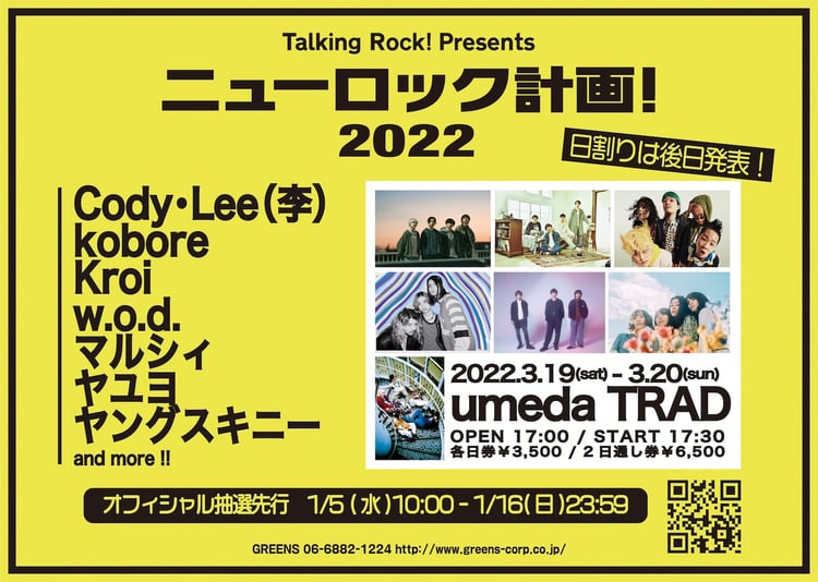 新型コロナウイルス感染拡大の影響により昨年、一昨年は開催見送りとなった「ニューロック計画!」。3年ぶりの開催となる今回は、第1弾出演アーティストとしてCody・Lee(李)、kobore、Kroi、w.o.d.、マルシィ、ヤユヨ、ヤングスキニーの7組がラインナップされた。