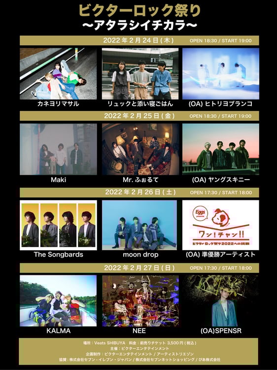 このイベントの24日にはカネヨリマサルとリュックと添い寝ごはん、25日にはMakiとMr.ふぉるて、26日にはThe Songbardsとmoon drop、27日にはKALMAとNEEが出演。またヒトリヨブランコが24日、ヤングスキニーが25日、SPENSRが27日のオープニングアクトに決定した。26日のオープニングアクトはオーディション「ワン!チャン!!~ビクターロック祭り2022への挑戦~」の準優勝アーティストが務める。オーディションの応募受付期間は1月18日まで。