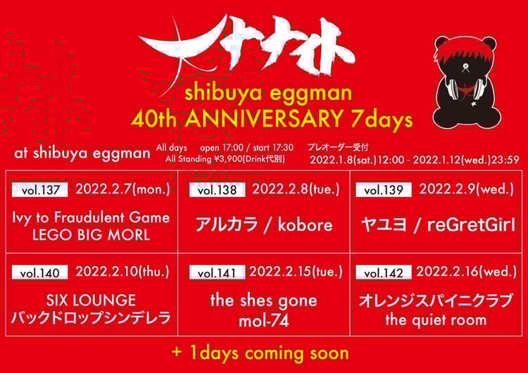 東京都渋谷区のライブハウス・shibuya eggmanの設立40周年を記念したライブイベント「大ナナイト~shibuya eggman 40th ANNIVERSARY 7days~」の開催が決定した。
