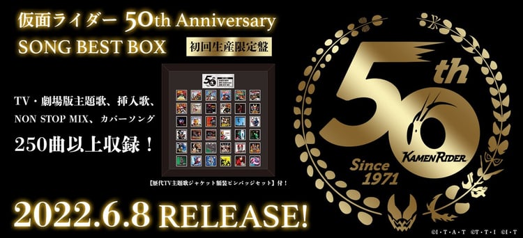 特撮ドラマ「仮面ライダー」シリーズの楽曲250曲以上を収録したボックスセット「仮面ライダー 50th Anniversary SONG BEST BOX」が、6月8日にリリースされる。