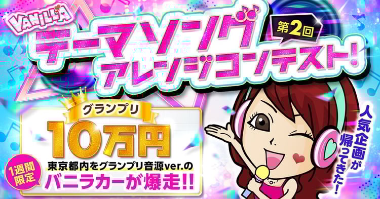 これは「バーニラバニラバーニラ求人! バーニラバニラ高収入!」でお馴染みのバニラテーマソングを使用したリミックス曲を公募する企画の第2弾。グランプリ受賞者には10万円が贈られ、グランプリ受賞音源が流れる“バニラカー”が1週間限定で東京・渋谷の街を爆走する。