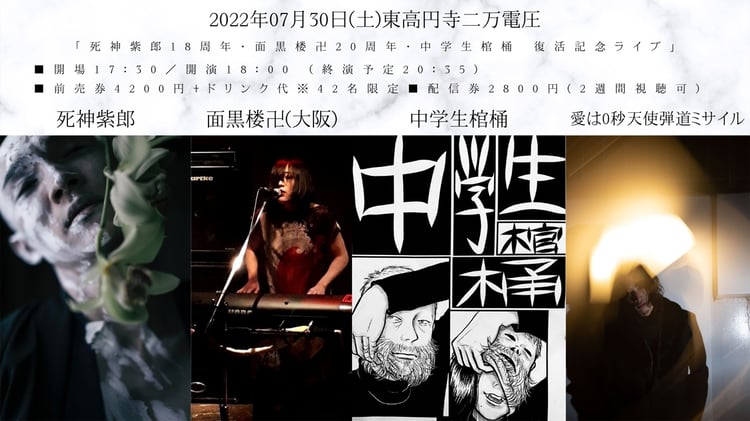 この企画は死神紫郎の活動18周年、面黒楼卍の活動20周年、中学生棺桶の復活を記念して行われるもので、3組に加え愛は0秒天使弾道ミサイルもオープニングゲストとして出演する。中学生棺桶は狩野葉蔵(ex. 例のK、SHOWKYOS ME)を中心に結成された“和製ドゥームサウンドの私小説パンクバンド”で、2000年代に都内を拠点に活動を行っていた。彼らがライブを行うのは2011年の解散以来およそ11年ぶりで、メンバーを一新して活動を再開する。