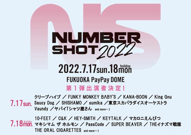 7月17、18日に福岡・福岡PayPayドームで開催される音楽フェス「NUMBER SHOT 2022」の出演者第1弾が発表された。