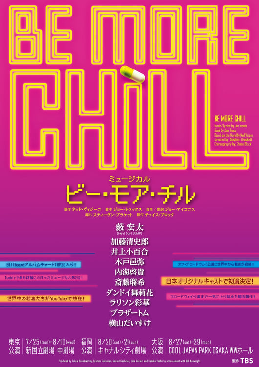 アジア初上演となる今回の日本公演には、薮のほか、加藤清史郎、井上小百合、木戸邑弥、内海啓貴、斎藤瑠希、ダンドイ舞莉花、ラリソン彩華、ブラザートム、横山だいすけという若手からベテランまで豪華なキャストが集結。薮は冴えない男子高校生のジェレミーを演じる。ジェレミーは、とある日本製スーパーコンピューター入りの錠剤「スクイップ」を手に入れることでとてもクールな青年に生まれ変わり、学校の人気者になっていく。「もっとクールに」を意味するタイトルの「Be more Chill」を、薮がどのように表現するのか、楽しみにしておこう。