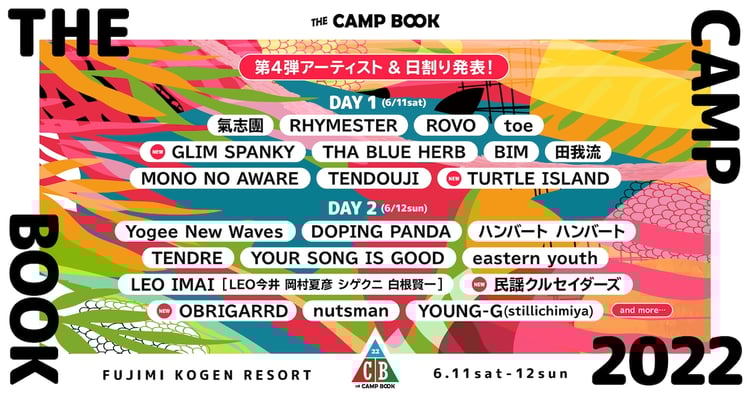 6月11、12日に長野・富士見高原リゾートで開催される野外フェス「THE CAMP BOOK 2022」の出演アーティスト第4弾と日割りが発表された。