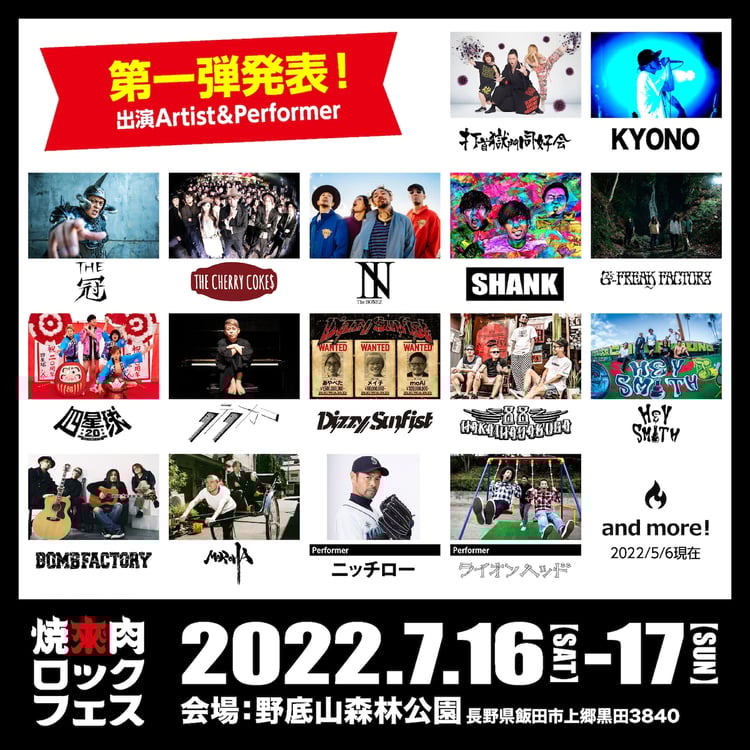 7月16、17日に長野・野底山森林公園で開催される「焼來肉ロックフェス2022」の出演者第1弾が発表された。
