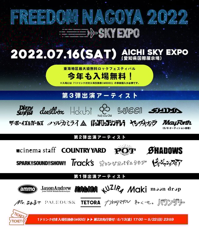 「FREEDOM NAGOYA」は2010年から開催されている入場無料の野外ロックフェスティバル。今回の発表でDizzy Sunfist、dustbox、Hakubi、Half time Old、LUCCI、SHIMA、THE BOYS&GIRLS、ハルカミライ、バックドロップシンデレラ、ヤングオオハラ、オーディション企画の優勝者・May Forthの11組の出演が明らかになった。